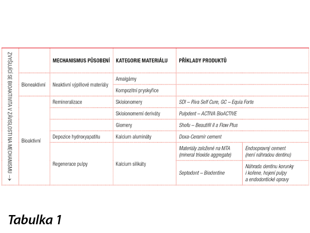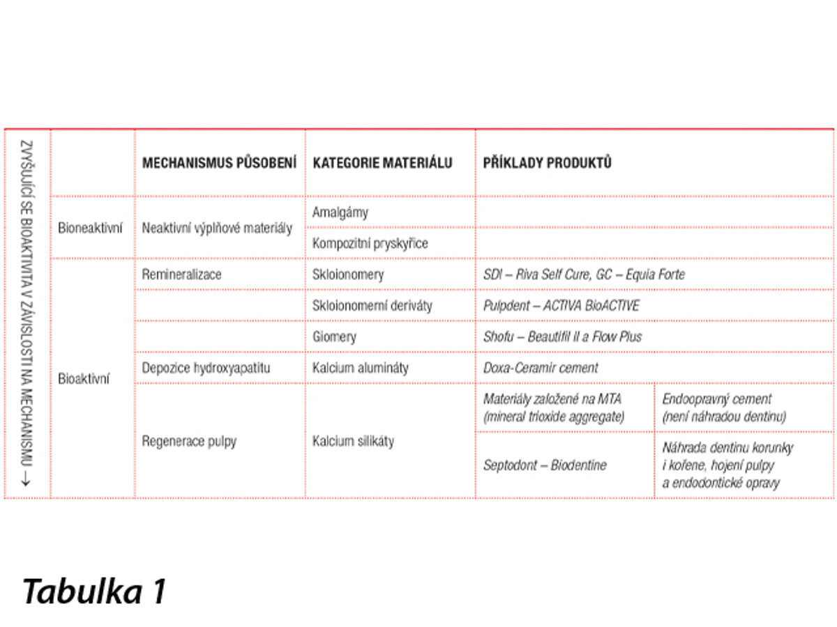 Tabulka 1: Příklady materiálů rozdělených dle mechanismu jejich působení od „neaktivních“ k „bioaktivním“: neaktivní | remineralizace | ukládání hydroxyapatitu a remineralizace | stimulace regenerace pulpy, remineralizace a ukládání hydroxyapatitu.