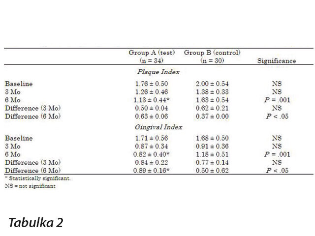 Výsledky této studie jsou uvedeny v tabulce 2. Výchozí indexy obou skupin byly dobře vyvážené. Průměrné hodnoty plaque indexu15 byly stanoveny na 1,68 až 1,71 pro kontrolní a testovanou skupinu. Statisticky významné zlepšení bylo pozorováno od výchozí hodnoty do 6 měsíců mezi kontrolní a testovanou skupinou. V testované skupině došlo také ke statisticky významnému zlepšení od výchozího stavu do 6 měsíců. Celkové zlepšení zdraví dásní bylo u testované skupiny 51,87 % a u kontrolní skupiny 30,18 %.