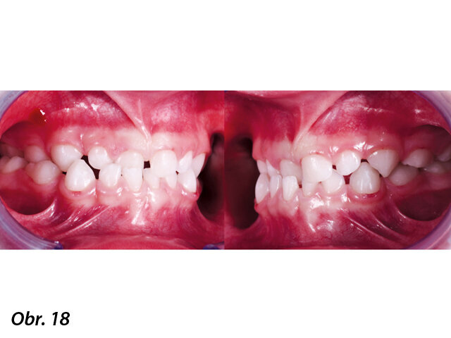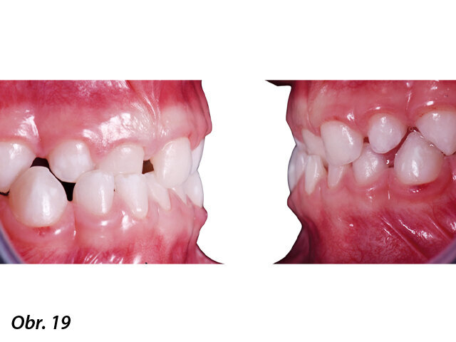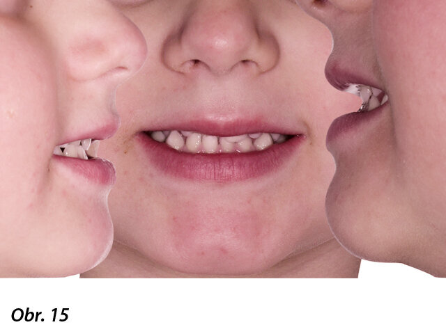 Pacient, 4 roky, dentální malokluze III. třídy, jednostranně zkřížený skus vpravo. Pacient byl léčen aparátem A.M.C.O.P. TC 2, který nosil každou noc a 1 hodinu odpoledne po dobu 8 měsíců s cílem vyřešit malokluzi nastolením správného okluzního vztahu: během léčby došlo k výraznému zlepšení nosního dýchání a tím k obnovení normálních dýchacích funkcí. Aparát pacient nosil v následujících měsících pouze v noci, aby byl stabilizován dosažený stav a byl pozitivně ovlivněn další vývoj chrupu. Ve věku 6 let se pacient podrobil komplexní ortodontické prohlídce včetně panoramatického a telerentgenového snímku pro analýzu prognózy růstu a stanovení možného dalšího kroku v elastodontické terapii (obr. 15–23).