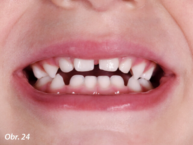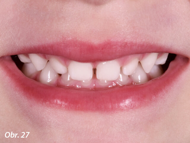 Dítě, 2 roky, s dlouhodobým zlozvykem dumlání prstů, atypickým polykáním, otevřeným skusem a zúžením horního oblouku. Rodiče uváděli potíže s dýcháním a opakovanými nachlazeními (obr. 24–28). Pacient byl léčen speciálním typem A.M.C.O.P. od Micerium ve tvaru „dudlíku“. Ten nevyžaduje otisk a je ideální pro pacienty s dočasným chrupem, zejména pro děti ve věku 2–3 let se zjevnou malokluzí. Výsledky byly dosaženy už za 6 měsíců terapie, kdy byl aparát nošen každou noc a 1 hodinu během dne. Po dosažení výsledku bylo nutné A.M.C.O.P. od Micerium nosit dalších 6 měsíců pouze v noci, aby byla zajištěna stabilita a obnovena funkce lingválních svalů a musculus orbicularis oris. Tento případ ukazuje, že primárním terapeutickým cílem je funkční korekce malokluze, která je u dětí v tomto věku častá.