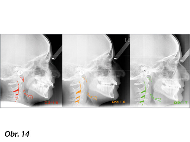 Pacient, 9,5 roku, II. skeletální třída, retrogenie, zúžení horního oblouku, předkus (9,5 mm), komprese krčních obratlů. Pacient uvedl, že trpí neustálými bolestmi hlavy. Zkoumání panoramatického a telerentgenového snímku ukázalo velkou diskrepanci mezi pravým a levým kondylem a zjevné zmenšení meziobratlového prostoru v místě prvních krčních obratlů. Pacient podstoupil elastodontickou terapii pomocí A.M.C.O.P. SC 3 pro II. třídu s cílem podpořit expanzi horního oblouku a předsunutí mandibuly. O rok později je patrné zlepšení v levém temporomandibulárním kloubu a zvětšení meziobratlového prostoru spojené s dopředným posunem mandibuly. Je také patrné zmenšení překusu a předkusu. Po 2 letech došlo ke zřetelné úpravě kondylů díky skeletálnímu působení A.M.C.O.P. a evidentnímu posturálnímu zlepšení se zvětšením prostoru mezi krčními obratli. Lze říci, že malokluze byla vyřešena, i když stav vyžaduje stabilizaci dosaženého stavu pomocí stejného aparátu (obr. 2–14).