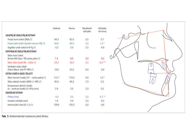 Pacientkou byla 30letá žena s konkávním profilem daným hypoplazií horní čelisti s krátkým horním rtem, prominencí dolního rtu, tupým nasolabiálním úhlem a skeletální III. třídou s maxilární retrognacií a mandibulární progenií. Co se týče dentálního nálezu, byla u pacientky diagnostikována III. třída s výrazným stěsnáním, obrácený skus, posun střední čáry o 1 mm, nevýrazná Speeova křivka a ageneze horních laterálních řezáků potvrzená na panoramatickém rentgenovém snímku (obr. 1a–j; tab. 1).