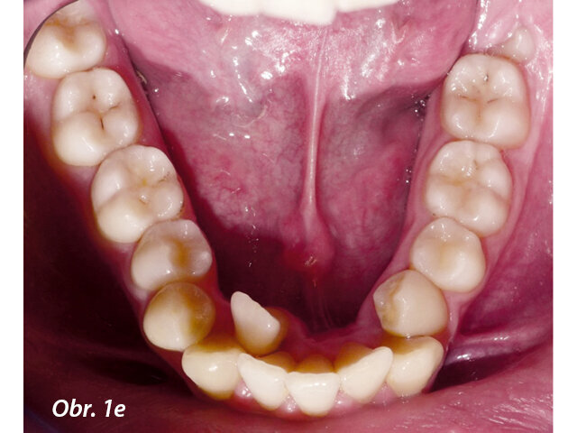 Kefalometrická analýza potvrdila I. skeletální třídu (ANB úhel: 4 °), mesodivergentní obličejové parametry (SN-GoGn úhel: 35 °) s retroinklinací dolních řezáků (úhel dolních řezáků k ML (IMPA): 84 °) a protruzí horních řezáků (+1-SN úhel: 117 °, obr. 10a, 11a).