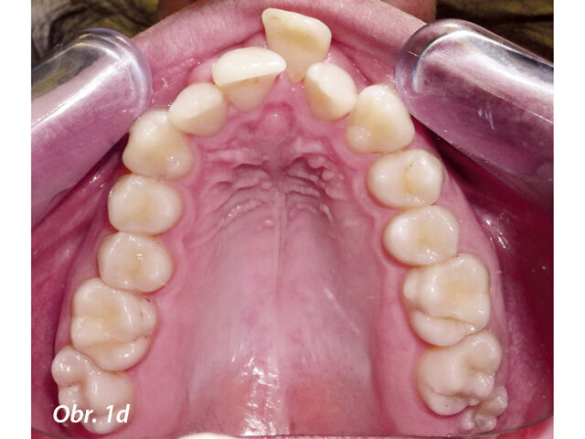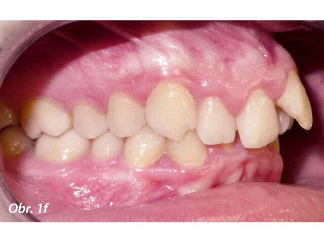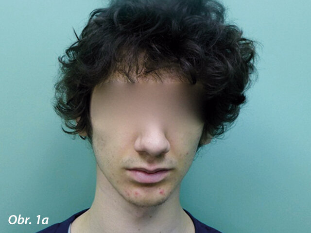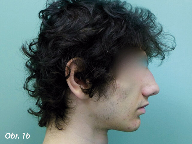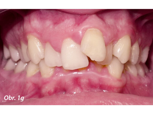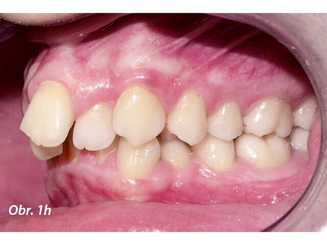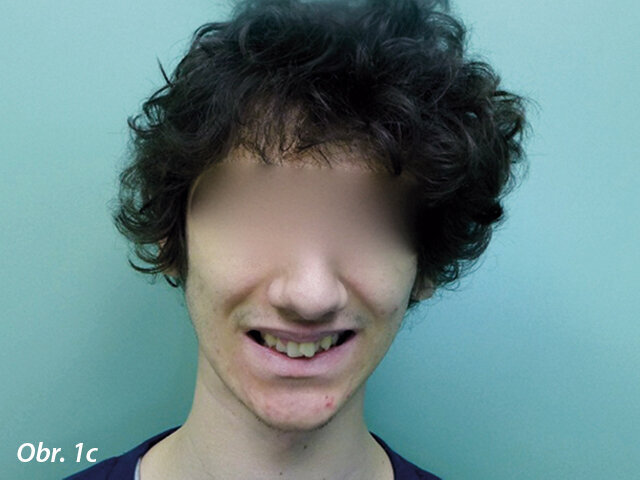 17letý chlapec přišel na konzultaci v prosinci 2014. Při intraorálním vyšetření bylo zjištěno: vztah molárů v I. třídě dle Anglea oboustranně a vztah špičáků v I. třídě vlevo a II. třídě vpravo. Šířka horního zubního oblouku v úrovni molárů byla normální, v místě premolárů však byl zubní oblouk výrazně zúžený a v mezišpičákové oblasti bylo výrazné stěsnání. V dolním zubním oblouku (úzký, tvar paraboly) bylo stěsnání s úplným deficitem místa pro zub 42, který byl v ektopické lingvální poloze. Hloubka skusu byla stoprocentní s traumatickým nákusem do gingivy v okolí dolních frontálních zubů. Zuby horního oblouku byly mírně větší než průměr, s malým nepoměrem Boltonova indexu. Objektivní extraorální vyšetření odhalilo syndrom dlouhého obličeje, vývoj střední třetiny obličeje byl normální a nazální pyramida byla široká ve spojení s mírnou mandibulární retruzí (obr. 1a–h).