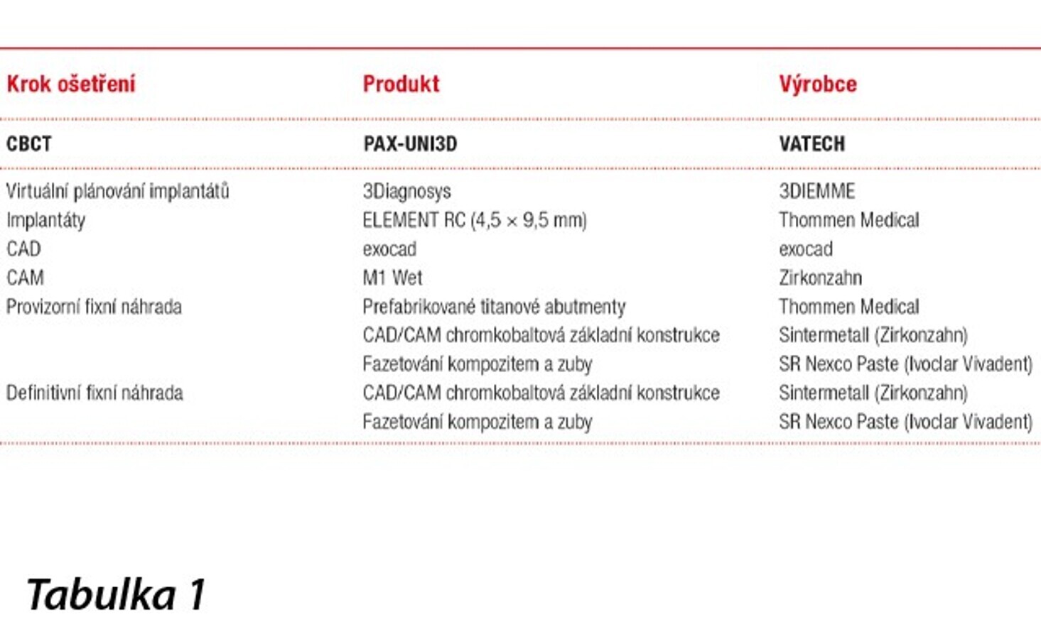 Digitální plánování implantátů (tabulka 1)
