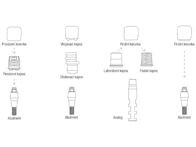 - Znovu připojte provizorní korunku nebo vhojovací kapnu na abutment
