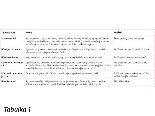 Umělá inteligence je stručně řečeno zastřešujícím pojmem pro řadu technologií a přístupů, které se snaží napodobit lidské myšlení při řešení složitých úkolů (obr. 1). Silně spoléhá na neuronové sítě s hlubokými strukturami, a jde tedy v podstatě o výpočetní systémy inspirované mozky živočichů. Každá z těchto výpočetních jednotek napodobuje, jak funguje neuron. Umělá inteligence není jen jedna technologie, ale spíše celý jejich soubor (tabulka 1). Většina z těchto technologií má pro oblast zdravotní péče bezprostřední význam, ale specifické procesy a úkoly, které podporují, se velmi liší.