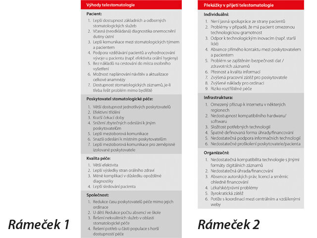 Byla publikována celá řada systematických přehledů zkoumajících výsledky a náklady spojené s telestomatologií. Jeden z prvních přehledů naznačuje, že tato technologie vede k lepším klinickým výsledkům a větší spokojenosti poskytovatelů i pacientů, stejně jako k úspoře nákladů.4 Využívání této technologie ke komunikaci s pacienty má řadu výhod. Stomatologičtí odborníci by si však měli být vědomi jejích rizik a používat pouze k tomu určené a bezpečné platformy, aby byla zajištěna ochrana osobních údajů (rámeček 1 a 2).