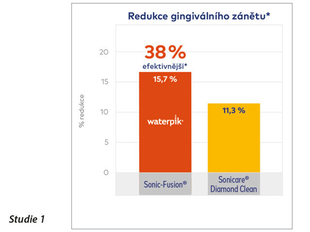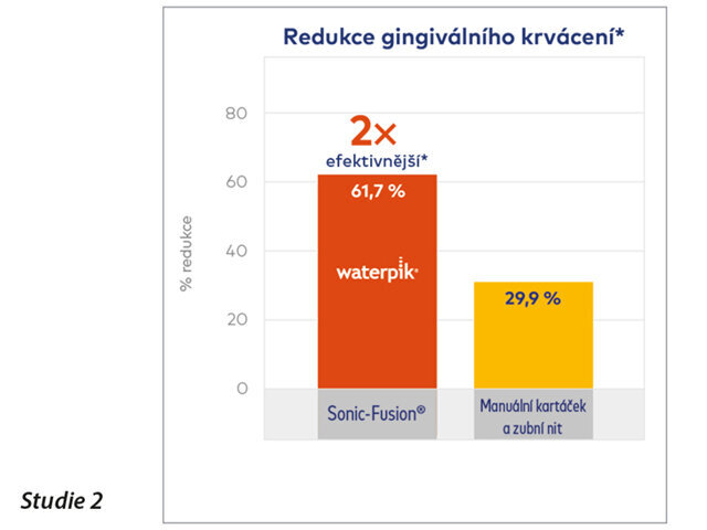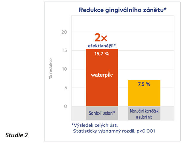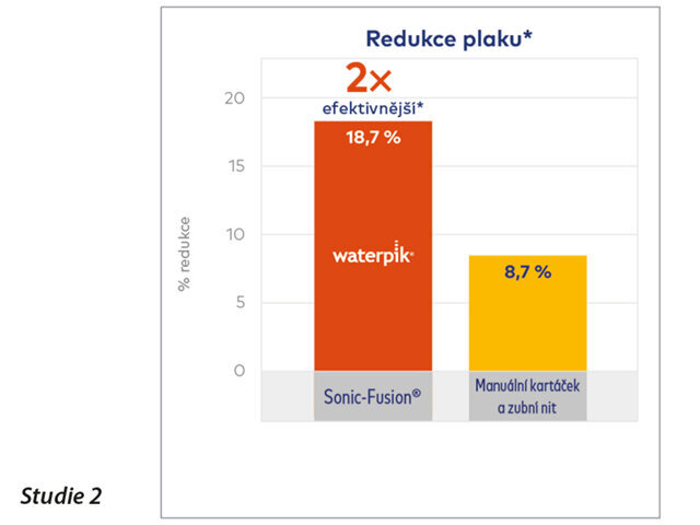 Cíl: Stanovení účinnosti Waterpik® Sonic-Fusion® v redukci plaku a klinických známek zánětu ve srovnání se standardním čištěním zubů a flossingem.
